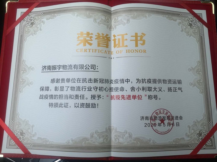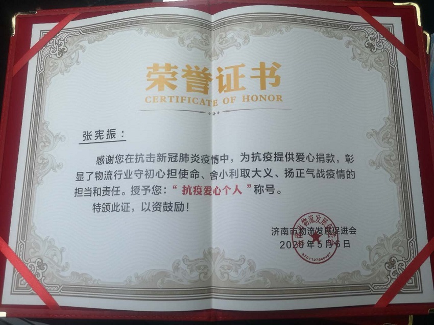 經(jīng)評選,振宇物流榮獲“抗疫先進(jìn)單位”,總經(jīng)理張憲振榮獲“抗疫愛心個人”!
