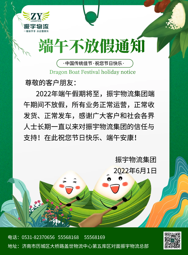 2022年端午假期將至,振宇物流集團(tuán)端午期間不放假,所有業(yè)務(wù)正常運(yùn)營(yíng),正常收發(fā)貨、正常發(fā)車,感謝廣大客戶和社會(huì)各界人士長(zhǎng)期一直以來(lái)對(duì)振宇物流集團(tuán)的信任與支持!在此祝您節(jié)日快樂(lè)、端午安康!