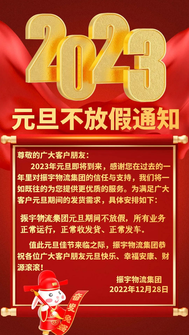 2023年元旦即將到來,感謝您在過去的一年里對振宇物流集團的信任與支持,我們將一如既往的為您提供更優(yōu)質(zhì)的服務。為滿足廣大客戶元旦期間的發(fā)貨需求,具體安排如下: