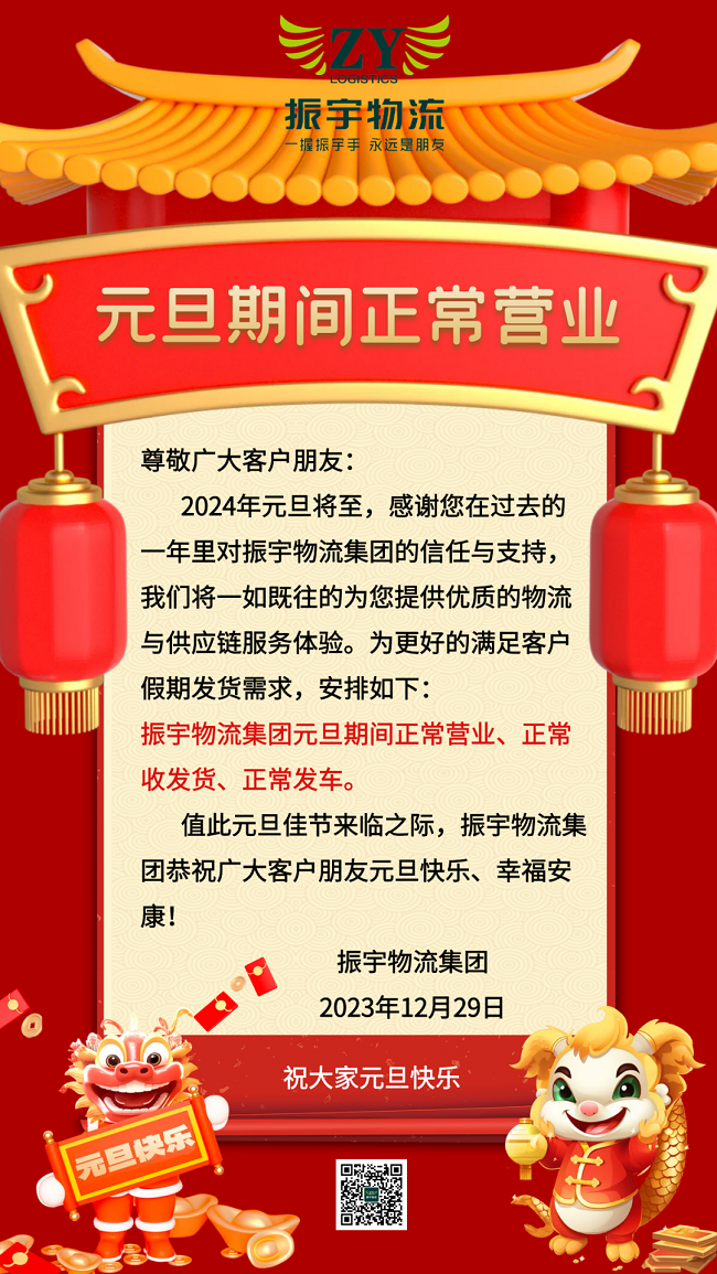 2024年元旦將至,感謝您在過(guò)去的一年里對(duì)振宇物流集團(tuán)的信任與支持,我們將一如既往的為您提供優(yōu)質(zhì)的物流與供應(yīng)鏈服務(wù)體驗(yàn)。為更好的滿(mǎn)足客戶(hù)假期發(fā)貨需求,安排如下: