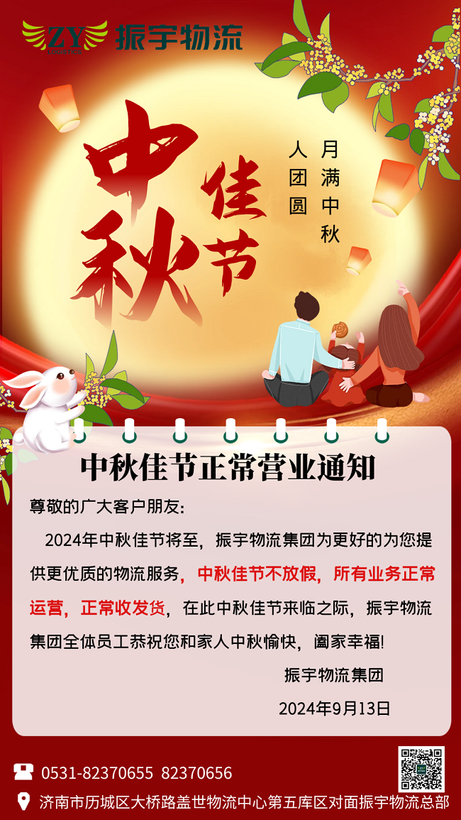 2024年中秋佳節(jié)將至,振宇物流集團為更好的為您提供更優(yōu)質(zhì)的物流服務(wù),中秋佳節(jié)不放假,所有業(yè)務(wù)正常運營,正常收發(fā)貨,在此中秋佳節(jié)來臨之際,振宇物流集團全體員工恭祝您和家人中秋愉快,闔家幸福!