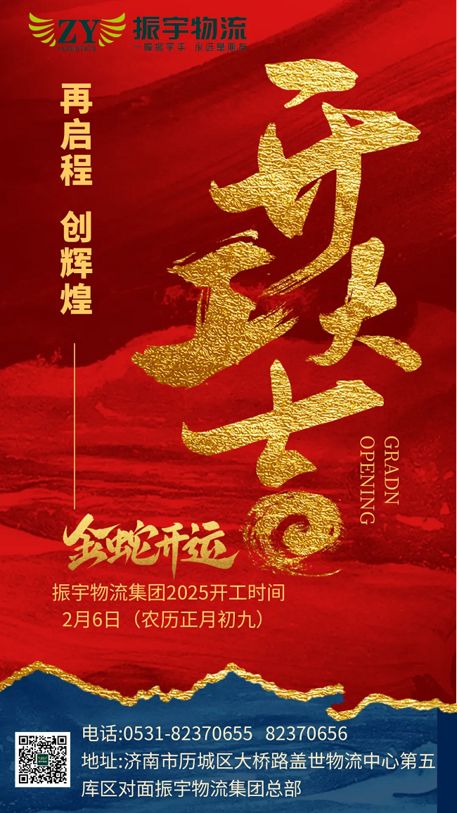 新春開工,瑞氣盈門!告別舊歲的忙碌,振宇物流在2025年的燦爛春光里,再次揚(yáng)帆起航,于2月6日(農(nóng)歷正月初九)正式開工!過去的成績是基石,新的一年,全體員工定以飽滿的熱情,用專業(yè)與高效,服務(wù)每一位客戶,全力奔赴新征程,向著更高的目標(biāo)破浪前行 。