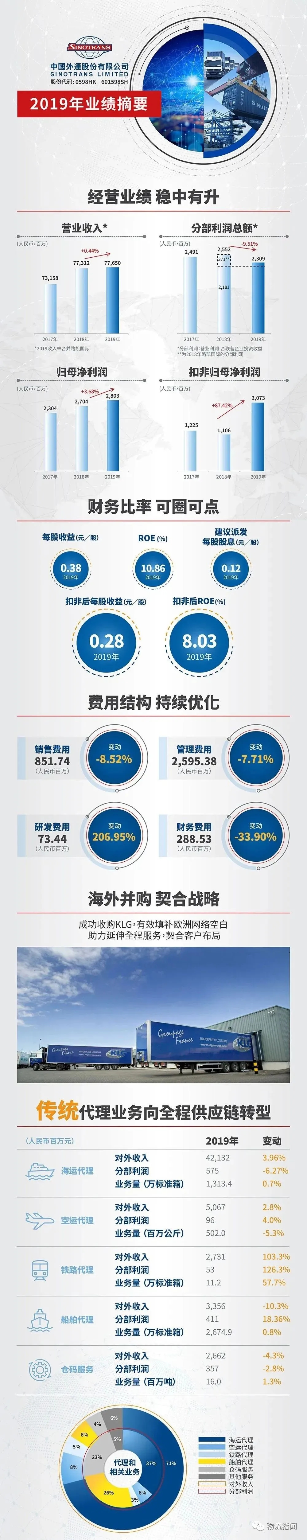 據(jù)悉,2019年,中國外運(yùn)實(shí)現(xiàn)營業(yè)收入776.50億元,同比增長0.44%(可比口徑下實(shí)現(xiàn)增長2.4%);分部利潤實(shí)現(xiàn)23.09億,可比口徑下實(shí)現(xiàn)增長5.9%。實(shí)現(xiàn)歸母凈利潤28.03億元,同比增長3.68% ;實(shí)現(xiàn)扣非后的歸母凈利潤20.73億元,同比增長87.42%。每股收益為0.38元人民幣。扣非后的ROE增長了3.08個(gè)百分點(diǎn)。