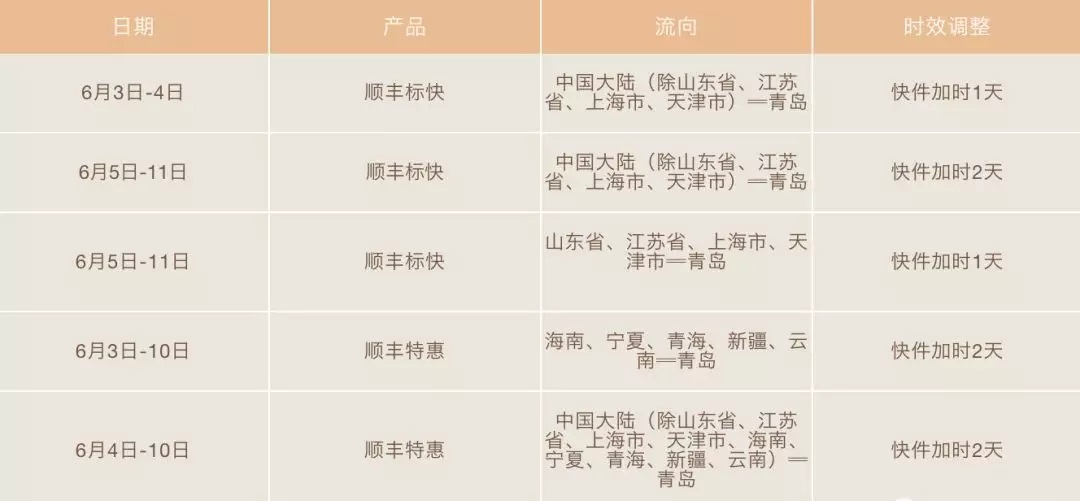 6月3日-11日,全網(wǎng)進(jìn)出青島流向的順豐次晨、即日、生鮮速配、部分醫(yī)藥冷運(yùn)等對溫度及時(shí)效要求較高的產(chǎn)品和冷藏冷凍件停收,物流普運(yùn)等重貨類產(chǎn)品停收(重貨快運(yùn)加時(shí)不停收)。