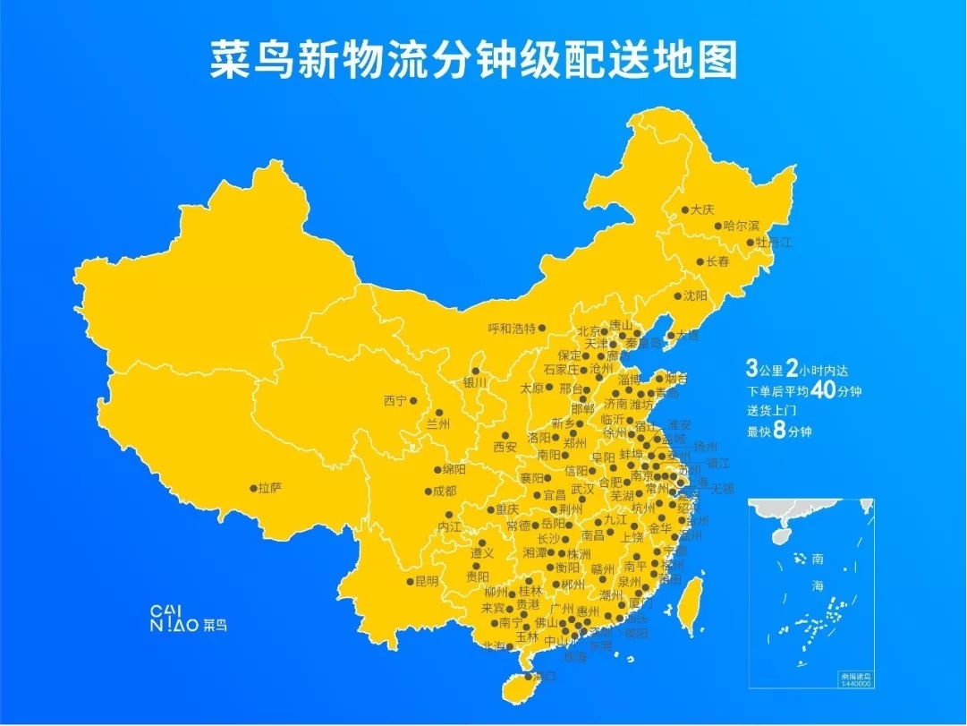 今年1月以來,菜鳥與天貓聯(lián)手商家及物流合作伙伴,共同推出門店發(fā)貨分鐘級配送服務(wù),“網(wǎng)上下單、樓下發(fā)貨”,目前平均用時40分鐘,最快僅8分鐘就送貨上門。