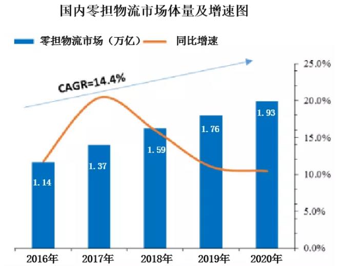 專家預測,到2020年,零擔物流(即專線物流)行業(yè)市場體量將達到近2萬億元。從2016年開始,整個市場都在以10%以上的速度在增長,發(fā)展前景十分廣闊。