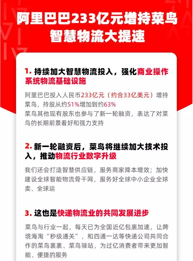 阿里巴巴集團(tuán)11月8日宣布,為持續(xù)加大智慧物流投入,強(qiáng)化商業(yè)操作系統(tǒng)物流基礎(chǔ)設(shè)施,已領(lǐng)銜完成對(duì)菜鳥網(wǎng)絡(luò)新一輪增資。阿里巴巴通過增資和購(gòu)買老股的方式,投入人民幣233億元(約合33億美元),持有菜鳥股權(quán)從約51%增加到約63%。菜鳥其他現(xiàn)有股東也參與了新一輪融資,表達(dá)了對(duì)菜鳥的長(zhǎng)期前景看好和強(qiáng)力支持。